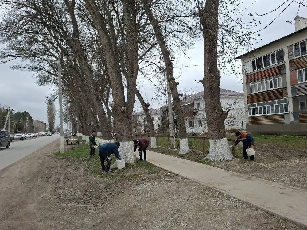 Первыми вышли сотрудники предприятия «Озеленение и благоустройство». На текущий момент начата побелка деревьев вдоль центральных улиц и в парковых зонах.