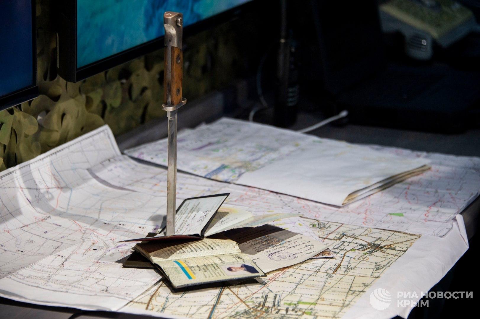 На столе, что вдоль стены, телефоны, рации, карты местности. Еще трофейные документы украинских военнослужащих. Эти удостоверения личности припечатаны к деревянной столешнице стальным клинком. Сбитые ракеты, макеты автомобилей.