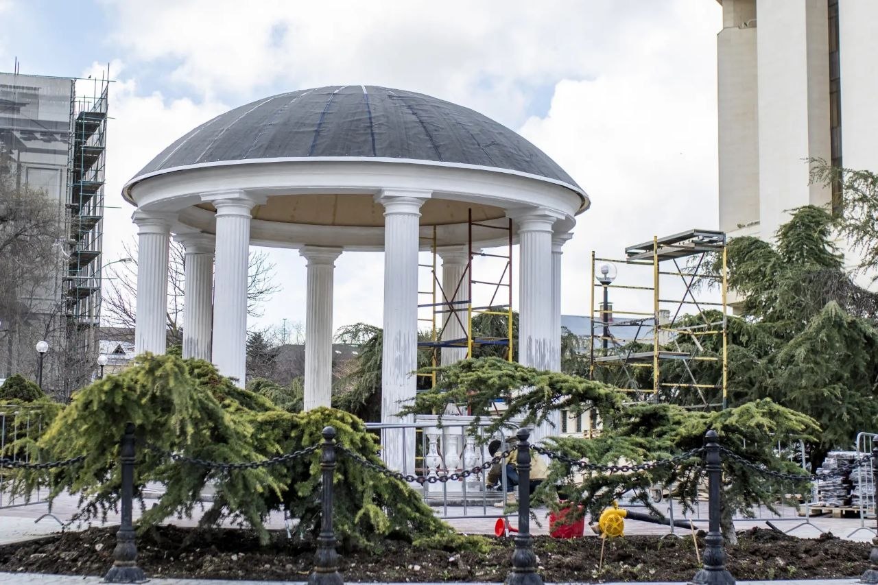 Сейчас в сквере Республики продолжается реконструкция фонтана, а также завершается обустройство архитектурной беседки с колоннадой.