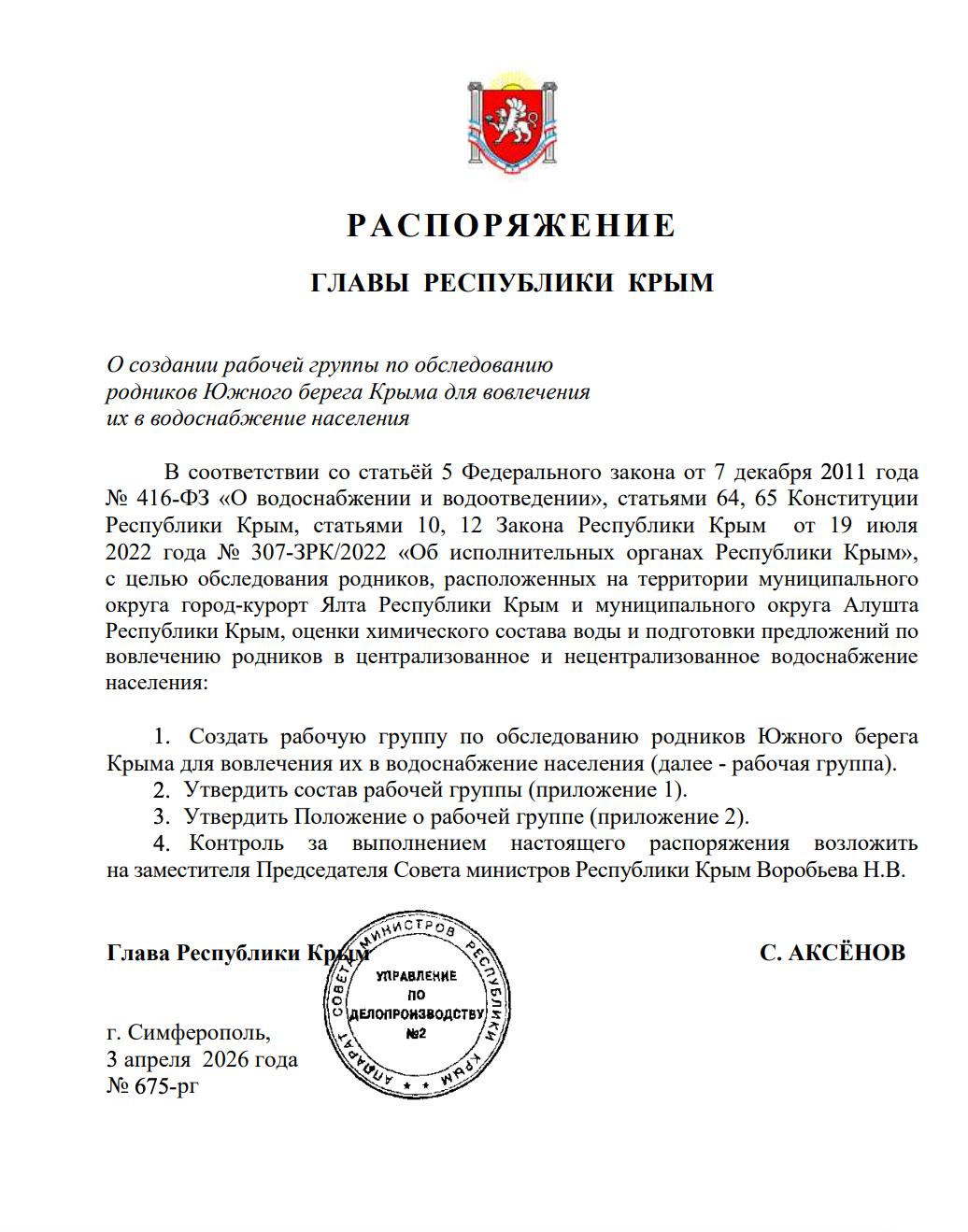 После обследования и определения возможности использования родников рабочая группа должна определить "приоритетность их включения в системы водоснабжения населенных пунктов Южного берега Крыма".
