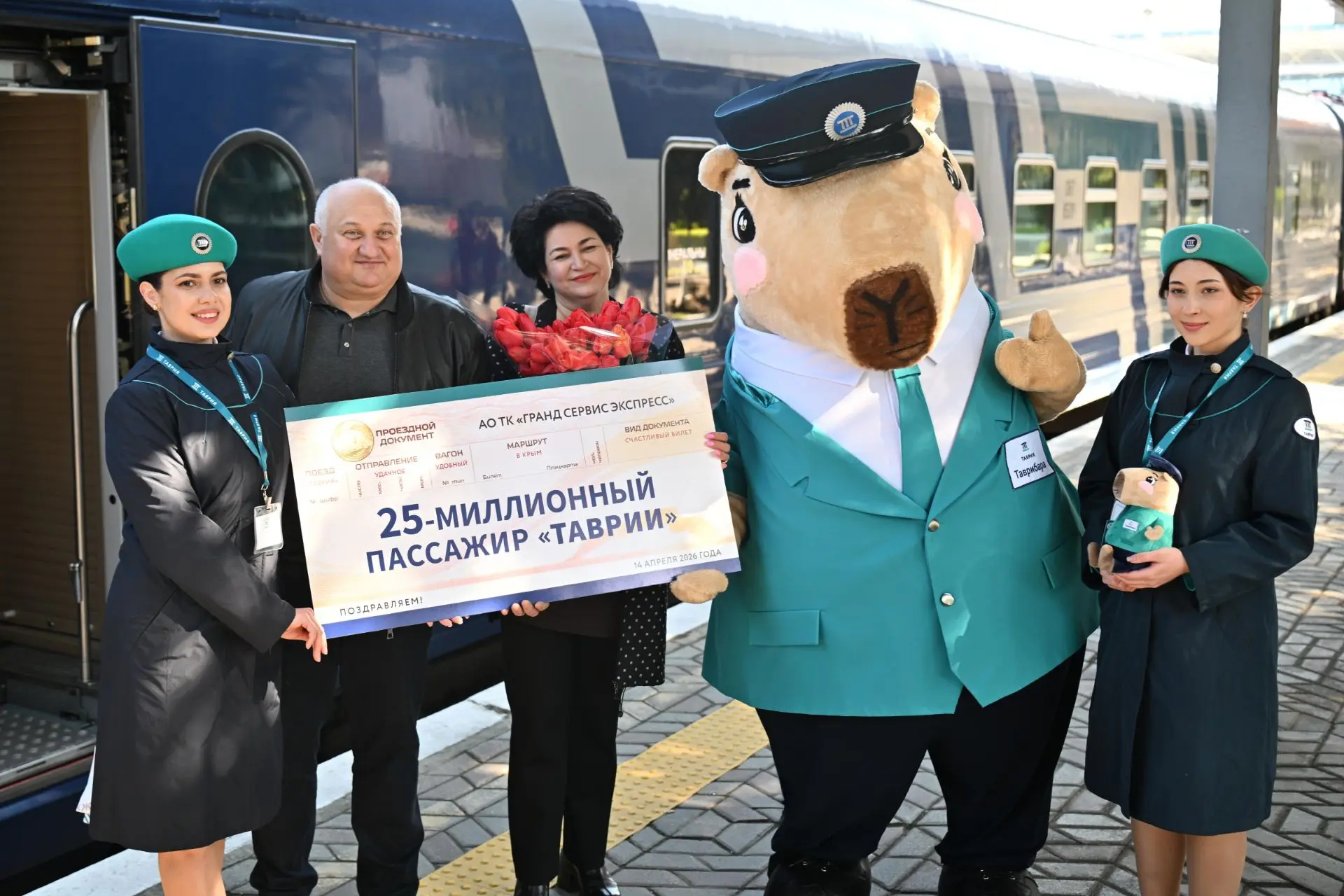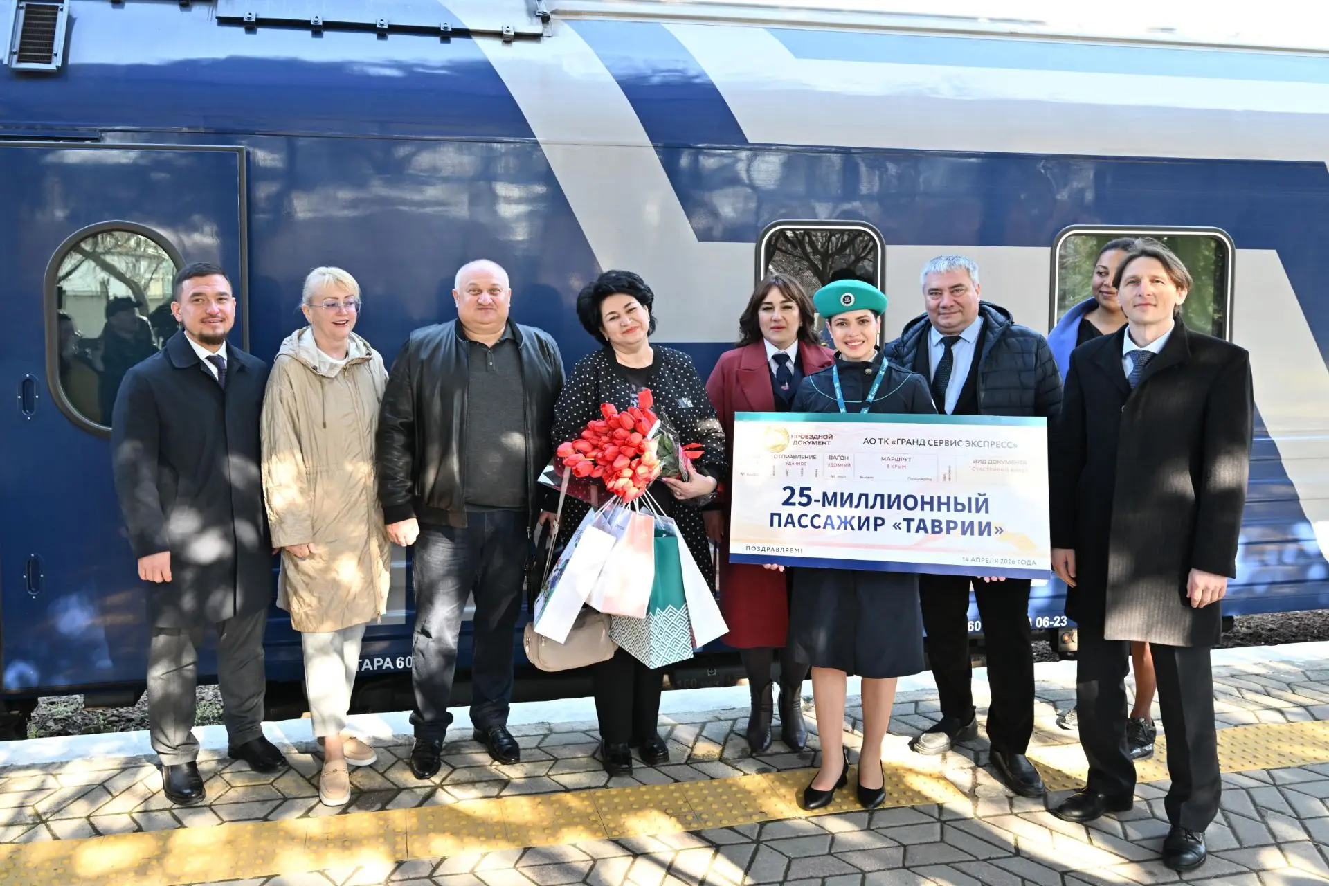 Юбилейная отметка была зафиксирована на вокзале Симферополя: в 9:15 на перрон прибыл поезд № 26/25 Минеральные Воды — Симферополь. Торжественную встречу провели представители транспортной компании «Гранд Сервис Экспресс», министры Правительства Республики Крым и руководство Крымской железной дороги. 25-миллионным пассажиром стала Надежда Бештауовна из Владикавказа — она приехала с мужем на отдых в Евпаторию и призналась, что поездка произвела самое благоприятное впечатление.