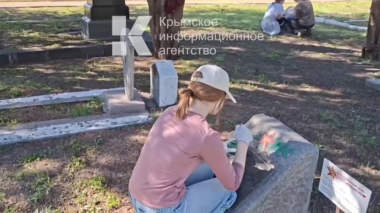 Студенты и преподаватели Крымского художественного училища им. Н.С. Самокиша ухаживают за надгробиями на Военном мемориальном кладбище Симферополя.