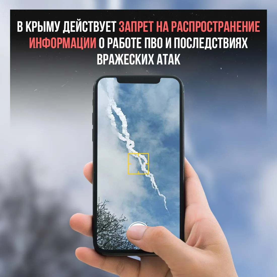 На территории Крыма действует запрет на распространение фото- и видеоматериалов, географических координат и иных данных о работе систем противовоздушной обороны, последствиях применения беспилотных летательных аппаратов и других чрезвычайных происшествиях