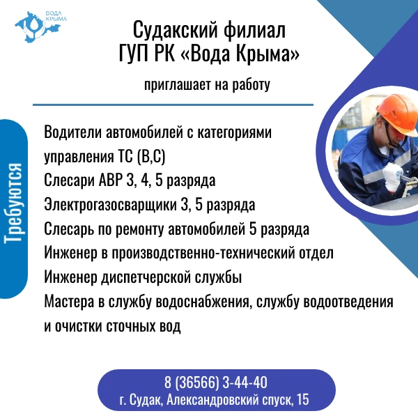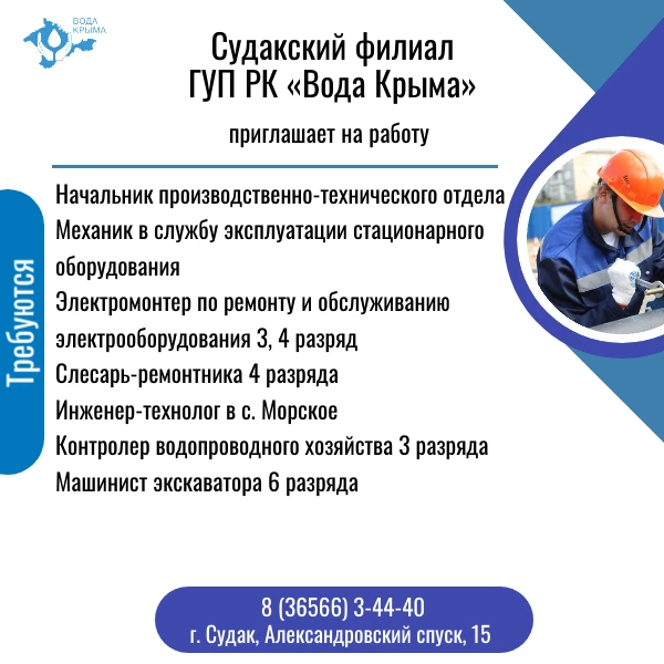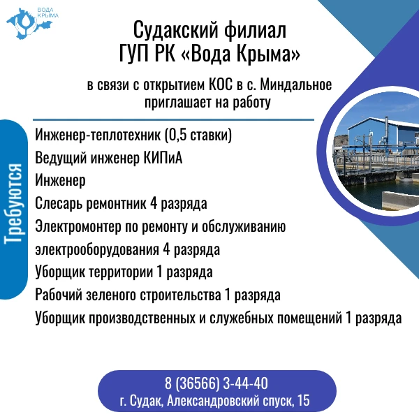 В связи с открытием новых очистных сооружений в селе Миндальное Судакский филиал объявляет набор персонала!