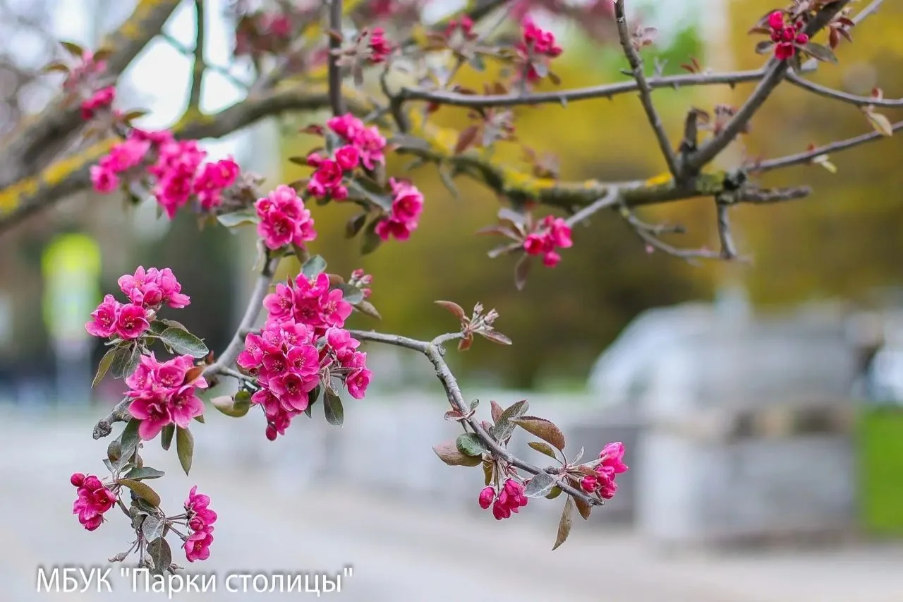В Гагаринском парке Симферополя цветут хеномелис, декоративные яблони, а ещё начинают распускаться бутоны сакуры