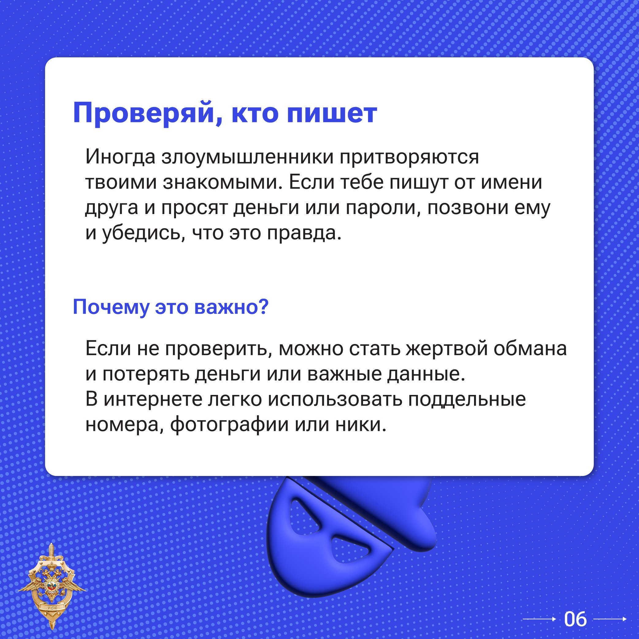И главное — предупредите близких. Расскажите родителям и друзьям. Один разговор может спасти от беды.