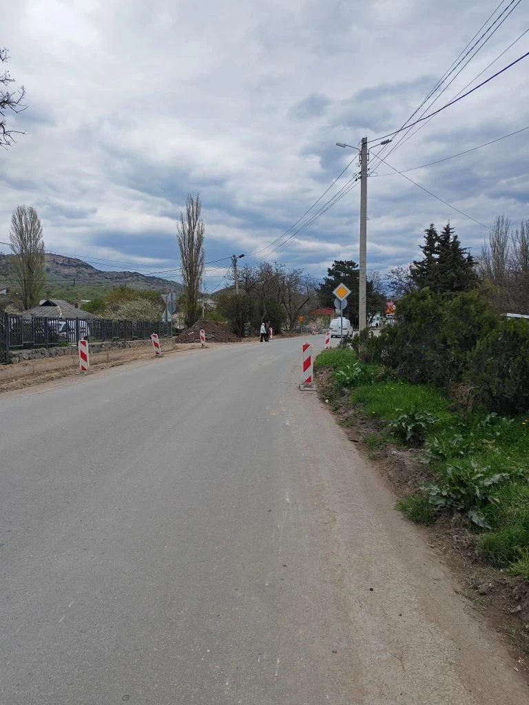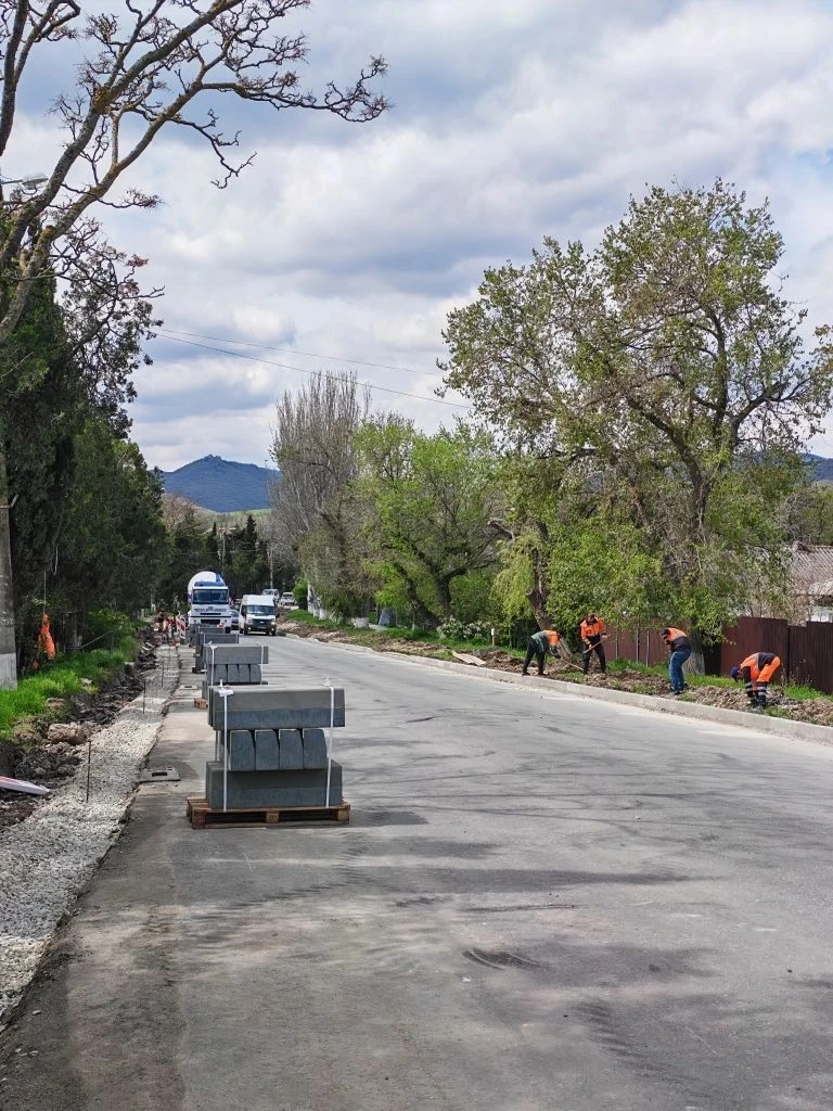 В поселке Щебетовка дорожники устанавливают бордюры. Работы идут по нацпроекту «Инфраструктура для жизни», заказчик — ГКУ РК «Служба автодорог Крыма».