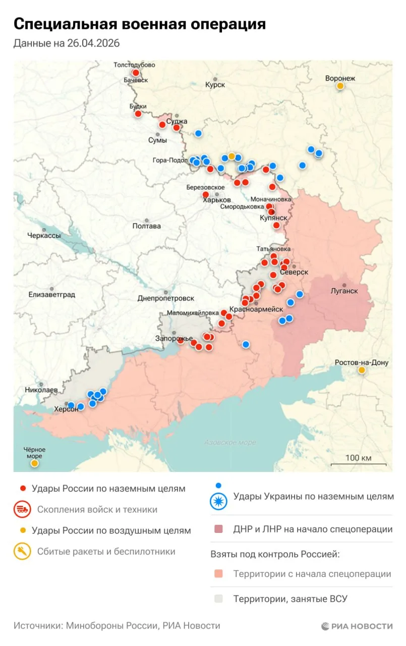 за 26 апреля 2026 годаРоссийские войска поразили судно в порту Одессы, а также поразили позиции в приграничных регионах Черниговской, Сумской и Харьковской областей. Из-за ураганного ветра и пылевых бурь активность операторов БЛА...
