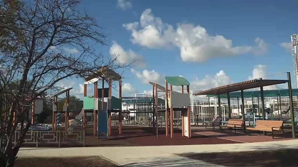 В сквере установили детскую площадку с разнообразными горками, качелями и любимыми детьми «паутинками». Поставили теннисный и шахматный стол, много удобных лавочек, урны. Смонтировали системы наблюдения, оповещения, поставили фонари. Есть здесь и арт-объект — рука, держащая гроздь винограда. Считаю, здесь попали в точку, ведь поселок находится среди бескрайних виноградников.
