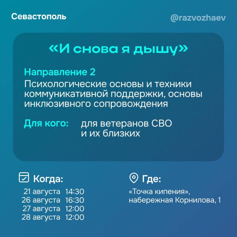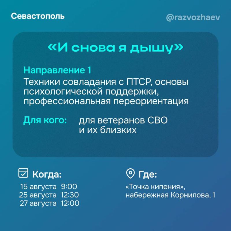 Курс «И снова я дышу» подготовлен специально для ветеранов СВО и членов их семей. Эта программа включает два направления.