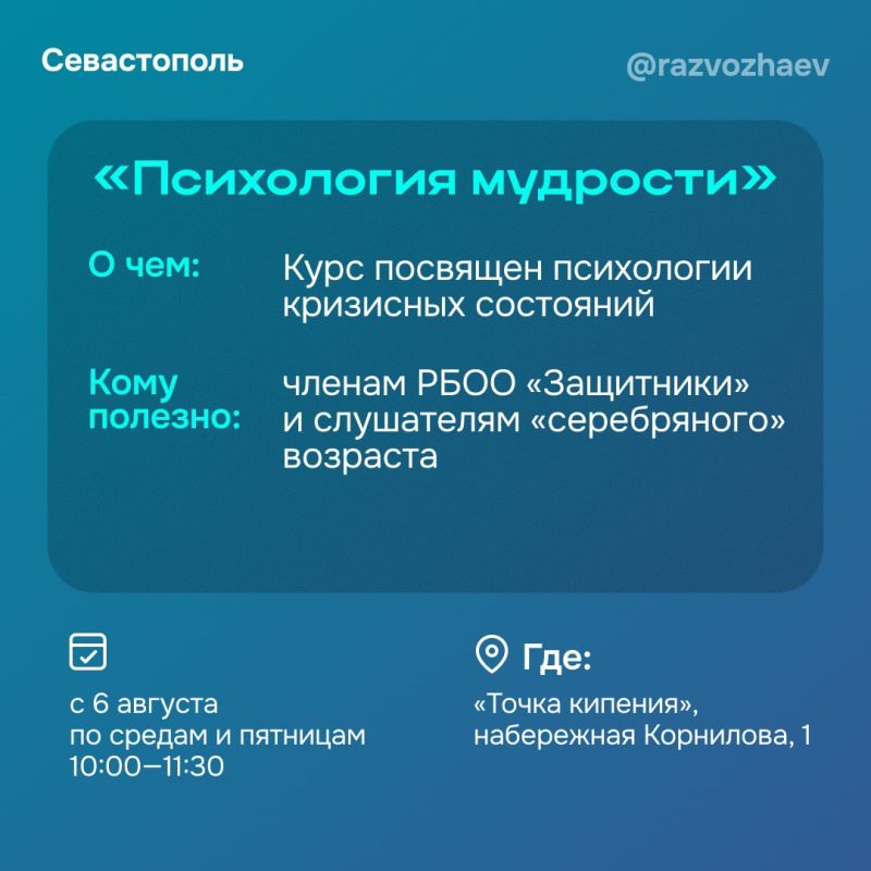 Курс «Психология мудрости» будет посвящён психологии кризисных состояний. По словам психологов, эти занятия будут полезны членам РБОО «Защитники» и слушателям «серебряного» возраста.