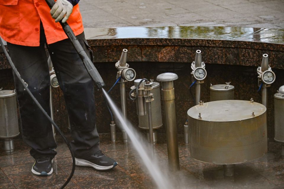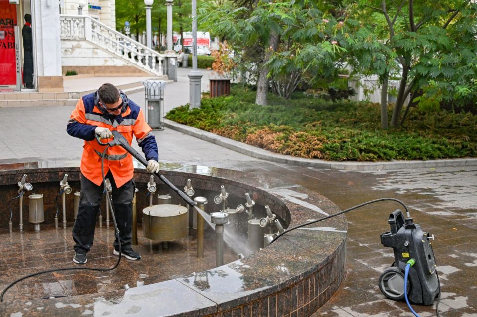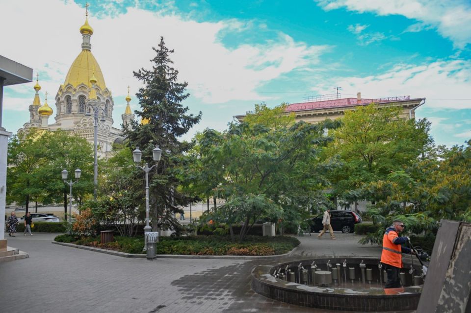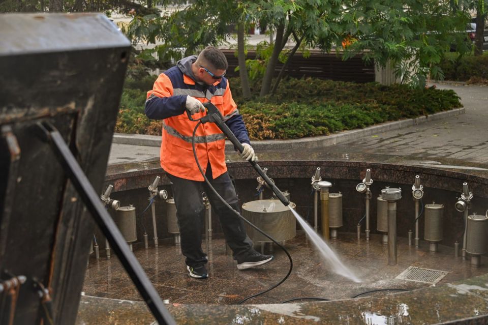 Сегодня специалисты работали над консервацией фонтана напротив Покровского собора Здесь уже слили воду из систем и моют чашу фонтана.