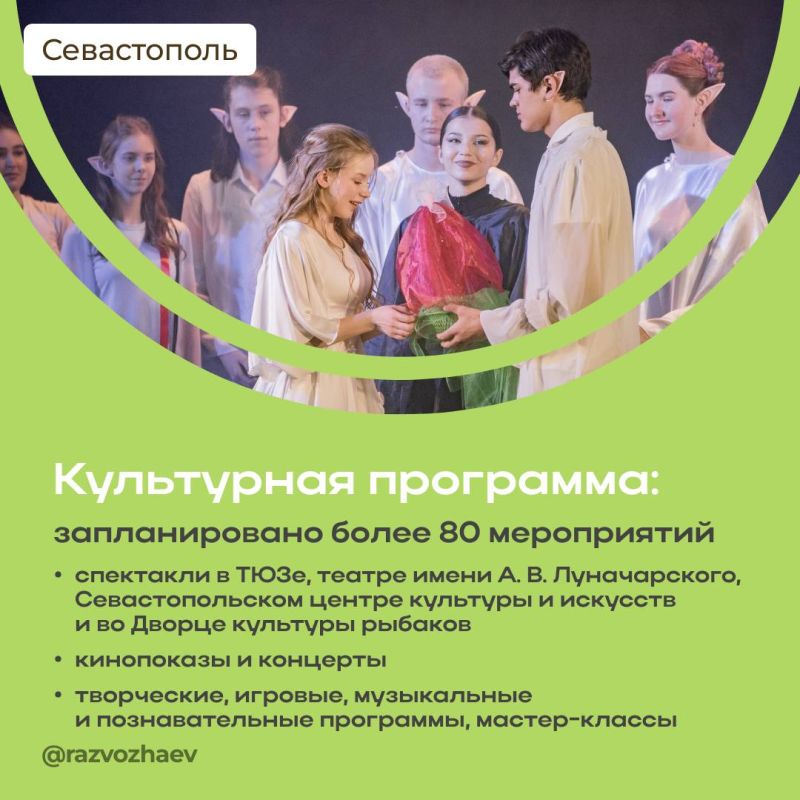 Департамент культуры также подготовил обширную программу мероприятий: кинопоказы, спектакли на двух площадках Севастопольского ТЮЗа, театре им. А.В. Луначарского, Севастопольском центре культуры и искусств, а также во Дворце культуры рыбаков. В библиотеках, домах культуры, клубах в том числе сельской местности ребят ждут музыкальные, игровые, познавательные и творческие программы.