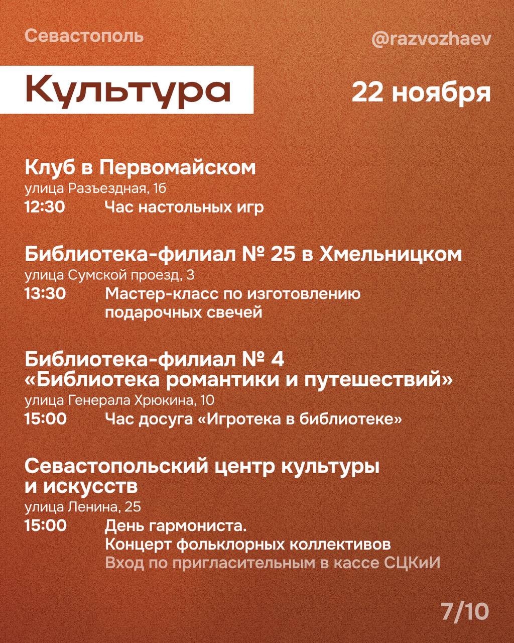 23 ноября во Владимирском соборе — усыпальнице адмиралов Гуманитарная миссия Севастополя проведёт благотворительную ярмарку. Все вырученные средства будут направлены на гуманитарную помощь для участников специальной военной операции и жителей фронтовых сёл. В программе: мастер-классы, батюшкина каша, подарки, концерт.
