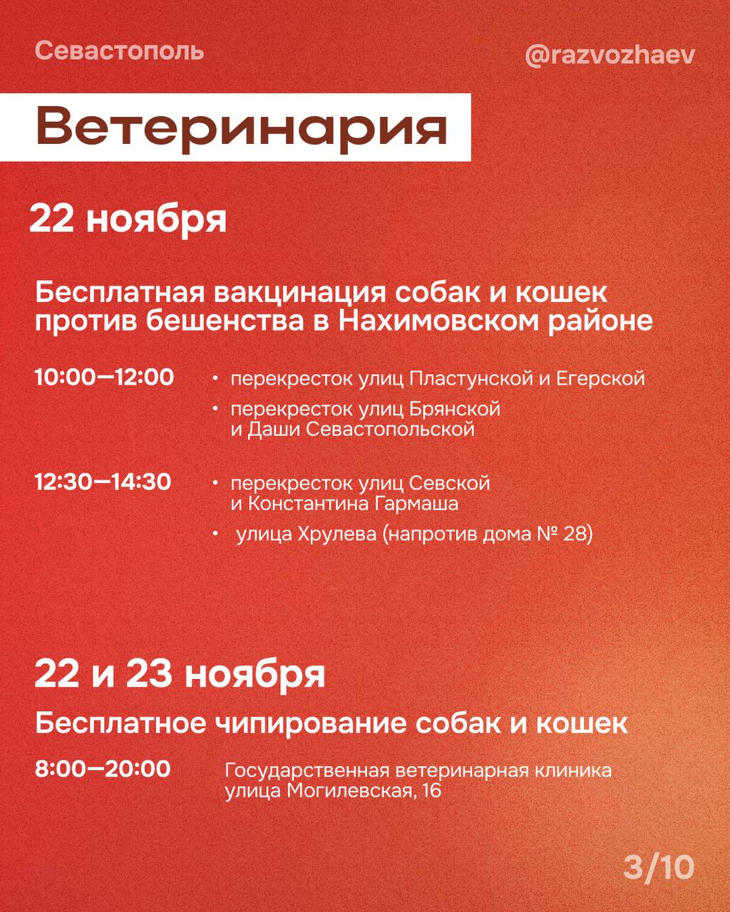 Ветеринары проведут выездную вакцинацию собак и кошек против бешенства. В эту субботу специалисты государственной ветслужбы будут работать в Нахимовском районе. По-прежнему в ветклинике на улице Могилёвской, 16 все желающие могут провести своим питомцам процедуру чипирования. Она занимает всего несколько минут, а чип даст возможность беспрепятственно путешествовать с питомцем, участвовать в международных выставках и облегчит поиск, если любимец потеряется.