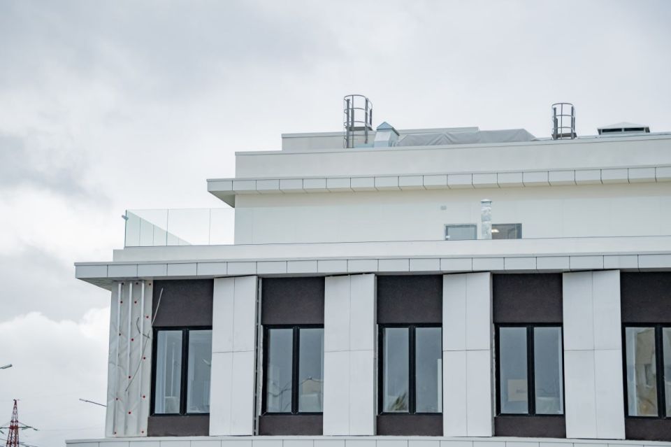 фасад здания почти готов, устанавливаются последние архитектурные панели.