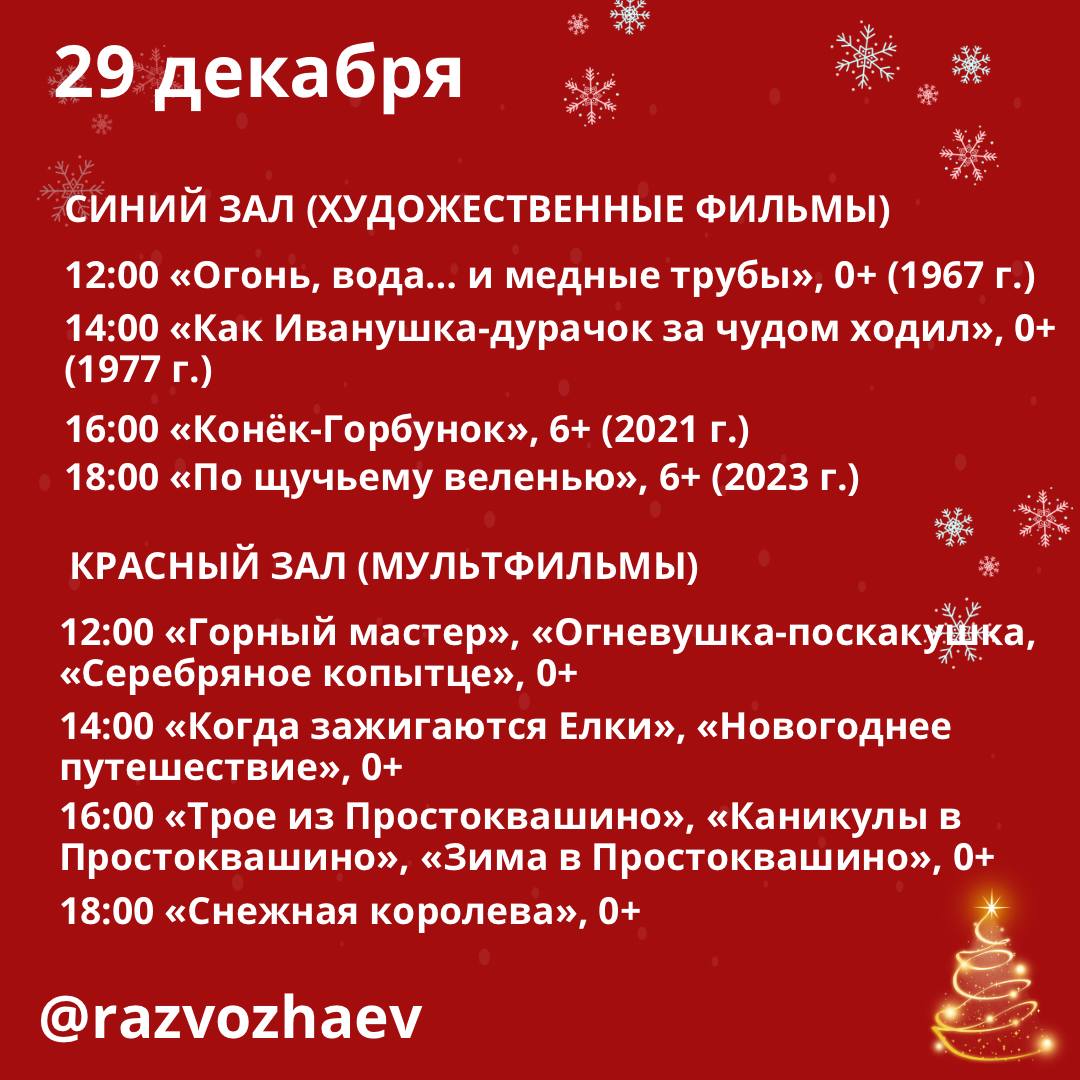 29 и 30 декабря показы будут проходить в течение всего дня. А 31 декабря кинотеатр «Победа» станет по-настоящему новогодним: перед каждым сеансом гостей ждет интерактивная программа с Дедом Морозом и Снегурочкой, играми, конкурсами и общением с детьми. Можно потанцевать, поучаствовать в веселых заданиях, почувствовать себя частью праздника и войти в Новый год с радостью и светлым настроением — еще до боя курантов.