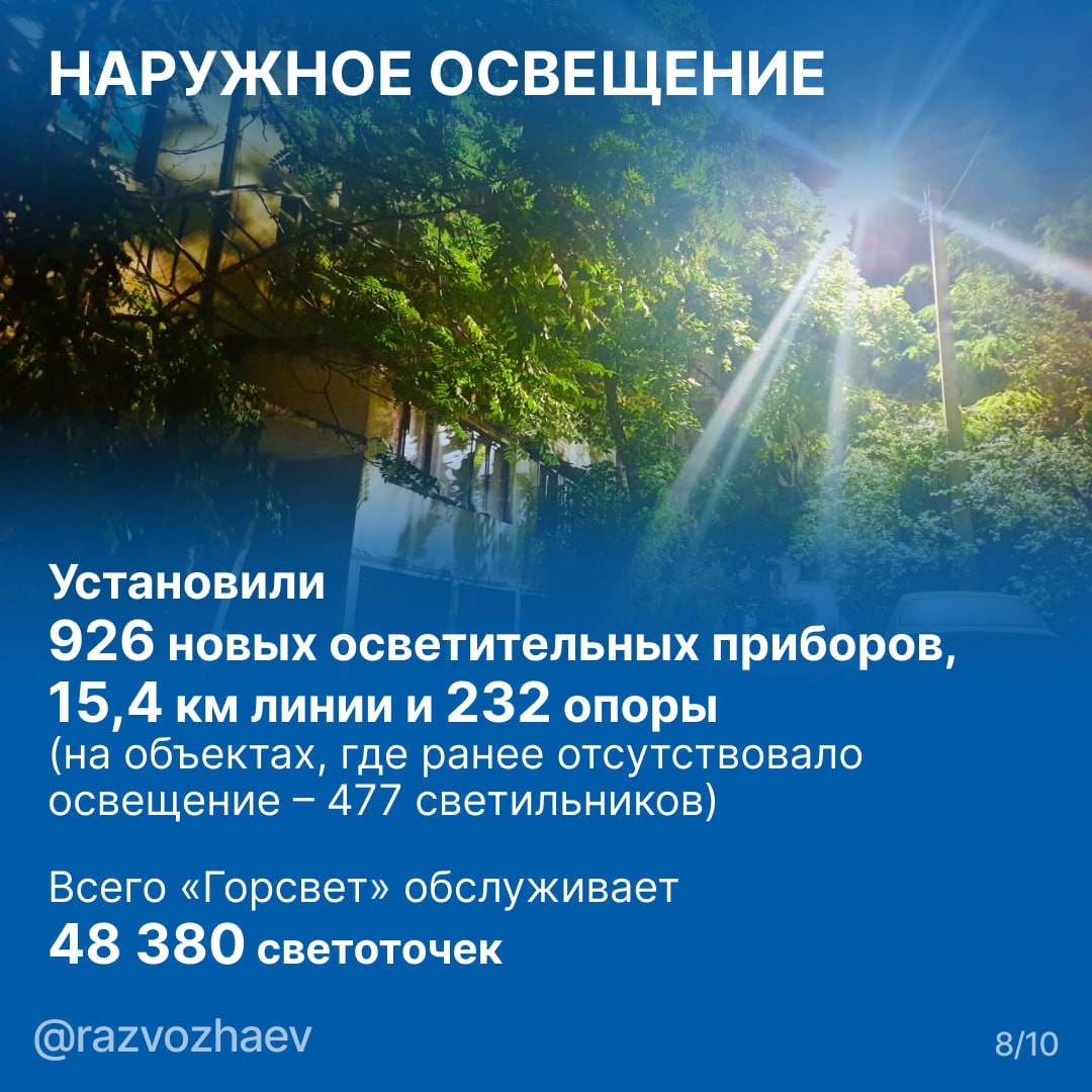 Наружное освещение. За год в Севастополе прибавилось 477 новых светоточек, всего их стало 48 380. «Горсвет» выполнил капитальный и текущий ремонты на 61 объекте, специалисты установили 926 светильников и проложили более 15 километров линий наружного освещения. Освещение появилось и на тех улицах, где раньше его не было.