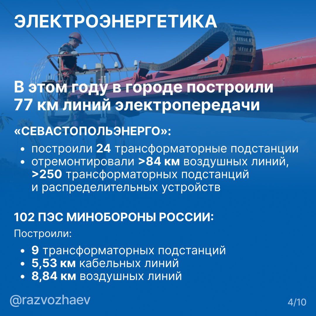 Электроэнергетика. Пожалуй, важнейшим событием, случившимся уже под конец года, стало решение о начале строительства подстанции 330 кВ «Нахимовская» — глава Минэнерго Сергей Евгеньевич Цивилёв дал поручение ответственным начинать все необходимые работы. Строить её будут «Россети». Мы, в свою очередь, сможем построить понижающие подстанции, в том числе для того, чтобы обеспечить стабильным энергоснабжением Фиолент.