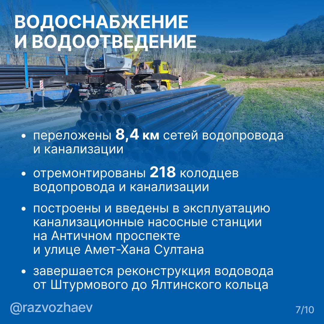 Водоснабжение и водоотведение. Переложили более 8 километров сетей водопровода и канализации, обновили очистные сооружения. Также «Водоканал» завершил ремонтные работы на магистральных участках в Верхнесадовом и построил новые канализационные насосные станции на Античном проспекте и улице Амет-Хана Султана. Завершается реконструкция магистрального водовода ГУ-3 от Штурмового до «Ялтинского кольца».