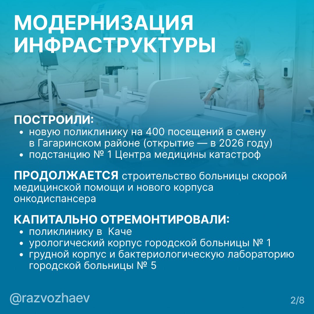 Мы продолжаем обновлять медицинскую инфраструктуру: в этом году завершили капитальные ремонты в поликлинике в Каче, урологическом корпусе первой горбольницы, а также в грудном корпусе и лаборатории пятой горбольницы. Продолжаем строительство медицинского комплекса — больницы скорой медицинской помощи и нового лечебно-диагностического корпуса онкологического диспансера на Камышовом шоссе. Завершено строительство новой поликлиники на улице Тараса Шевченко на 400 посещений в смену, открыть поликлинику планируем уже в следующем году.