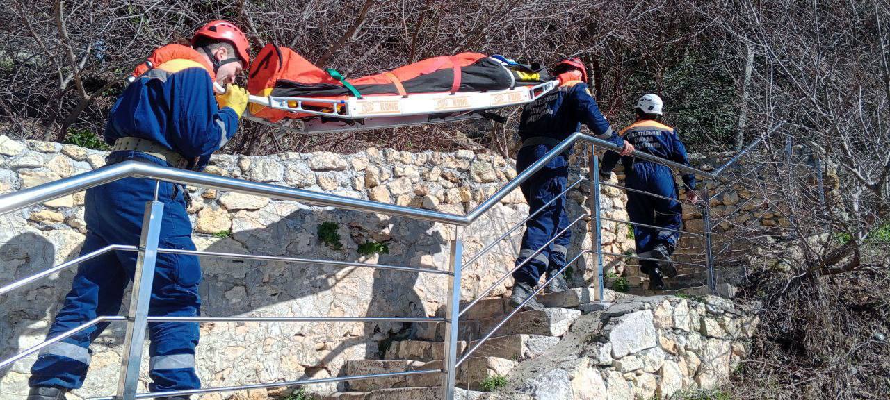 На помощь оперативно выехала дежурная смена поисково-спасательного отряда «Юг». Спасатели на носилках подняли пострадавшую вверх по лестнице к машине скорой помощи.