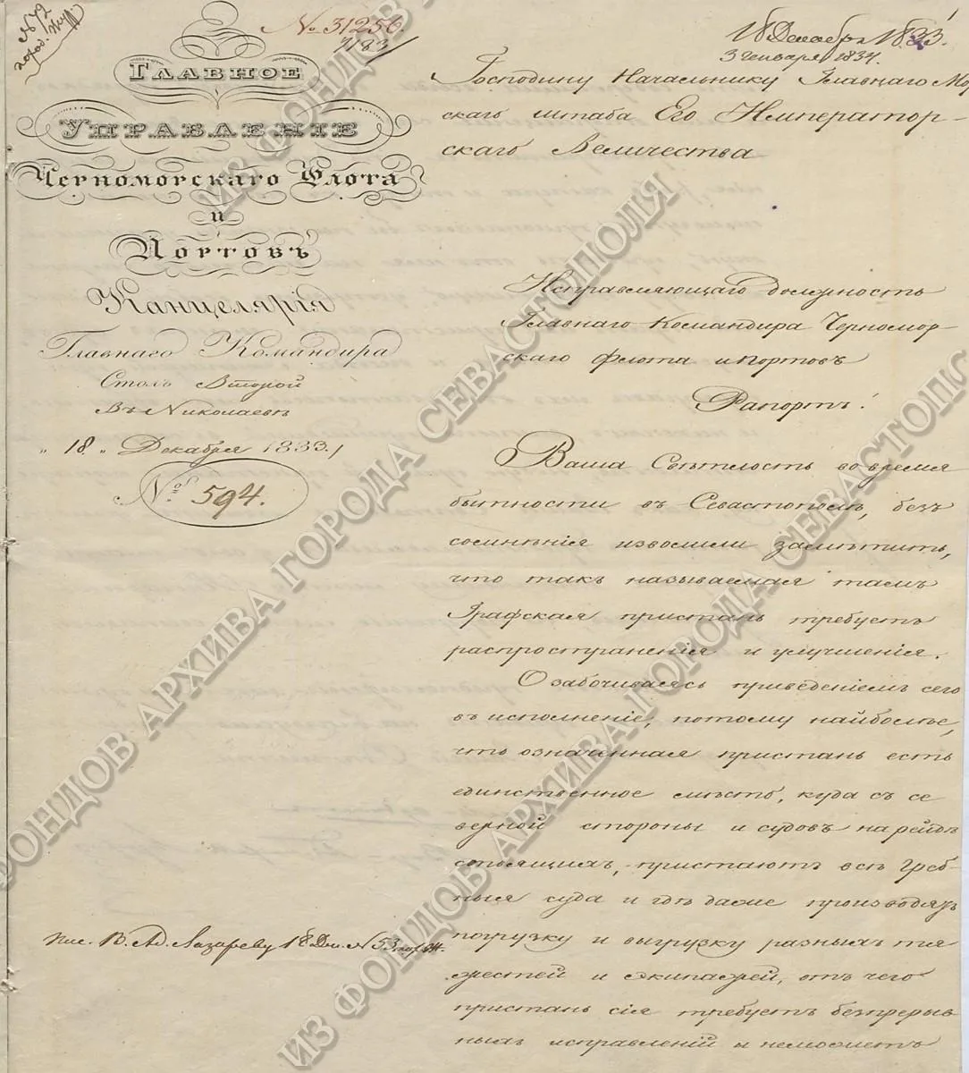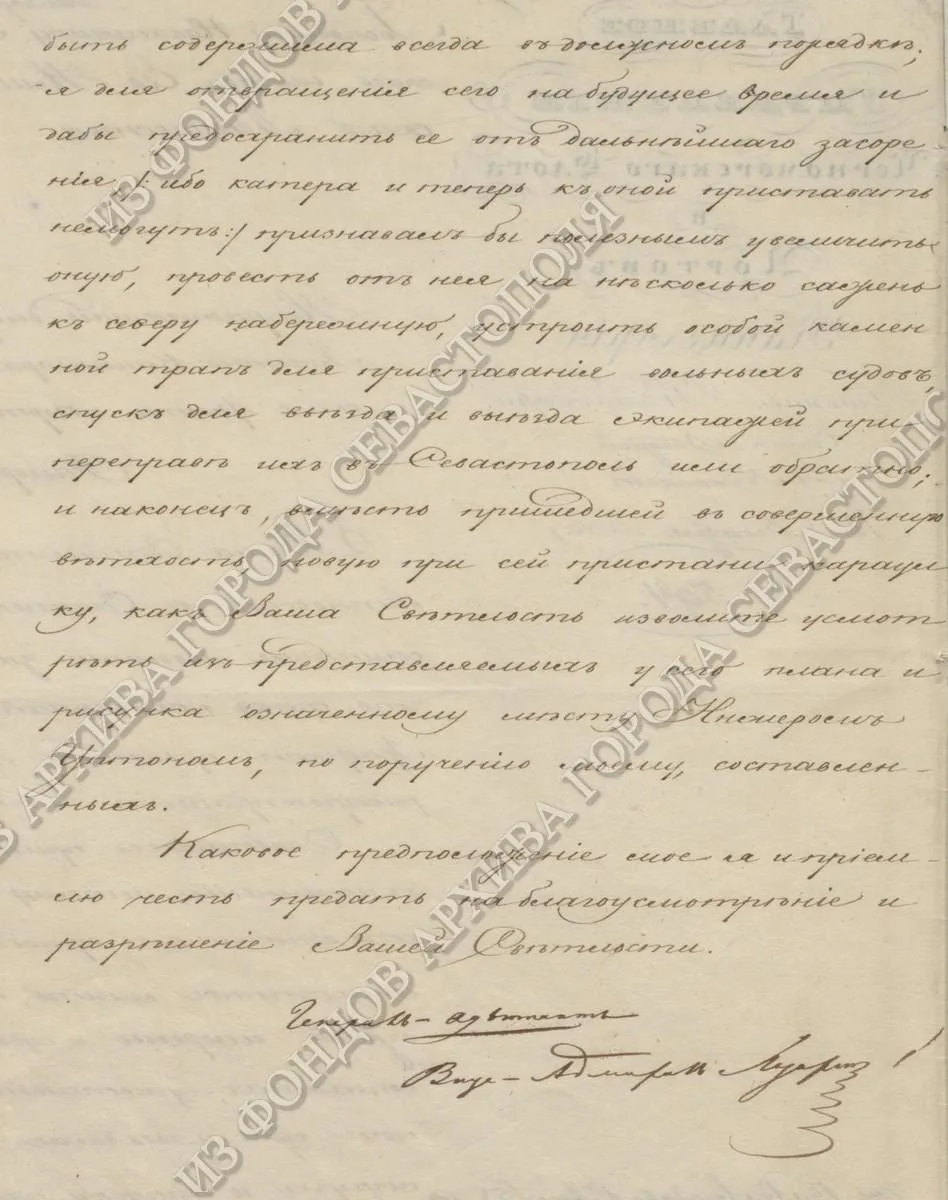 Он проявил себя и как блестящий градоначальник. Под его руководством разработали и утвердили Генеральный план застройки города. При его непосредственном участии сложился исторический центр: разбит Матросский бульвар, открыт первый севастопольский памятник — Александру Ивановичу Казарскому, заложен Владимирский собор на центральном холме, благоустроена Графская пристань. В городском архиве хранится рапорт главного командира Черноморского флота и портов вице-адмирала Лазарева начальнику Главного военного штаба о необходимости постройки новой пристани на берегу Южной бухты. Документ датирован 18 декабря 1833 года.