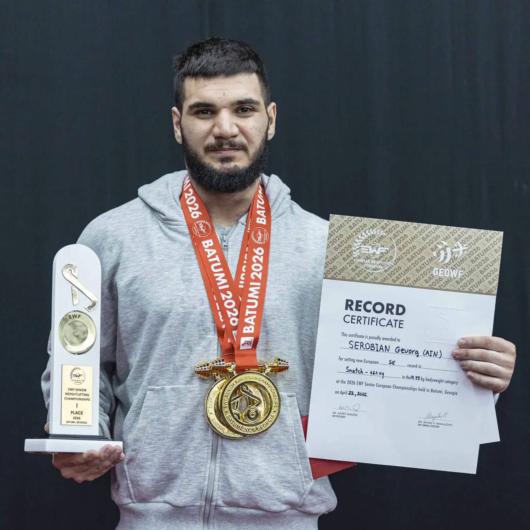 Геворг Серобян также стал чемпионом Европы. На соревнованиях в Грузии он выступал в весовой категории до 79 кг и показал лучший результат: 180 килограммов в толчке штанги и в сумме – 341 килограмм.