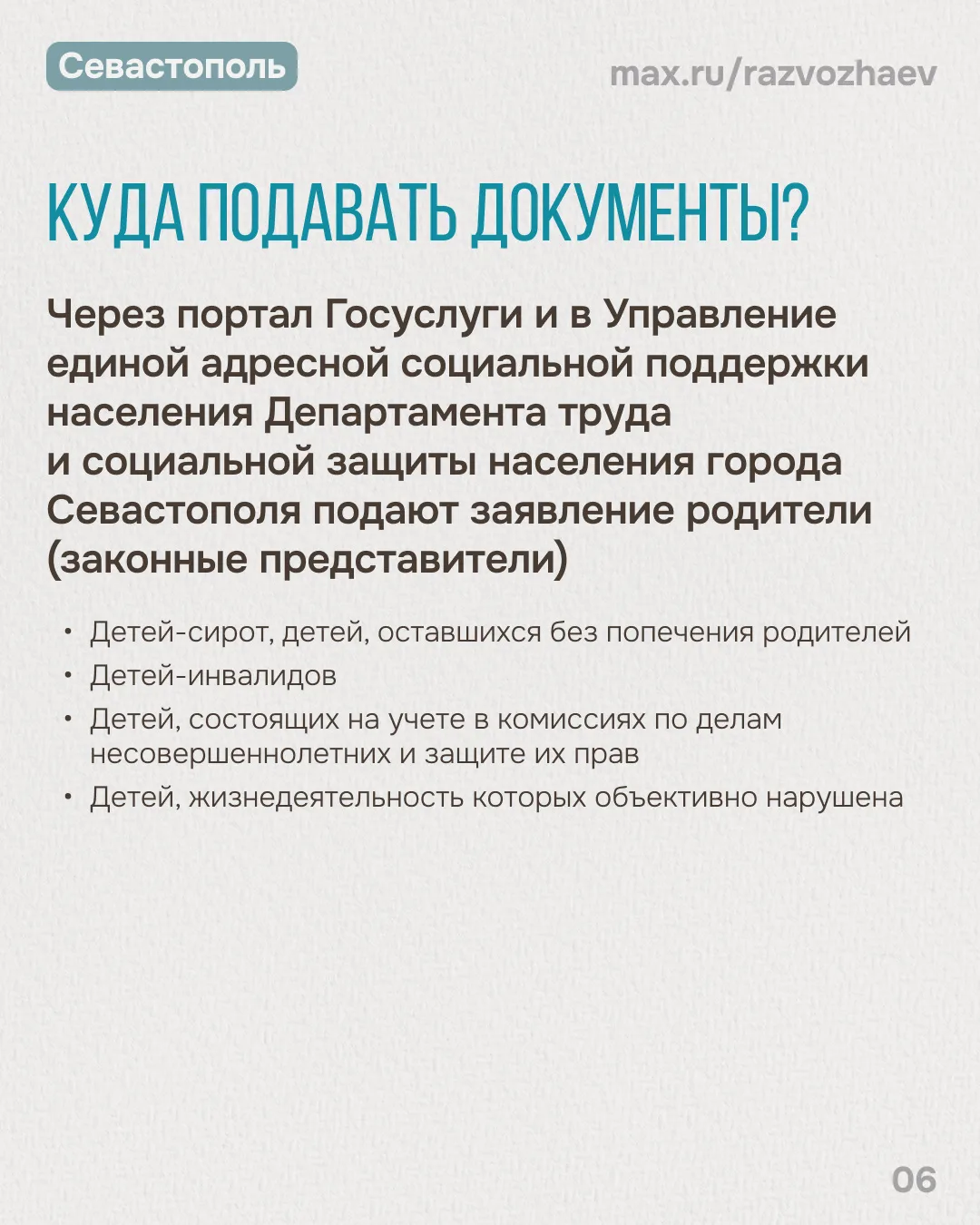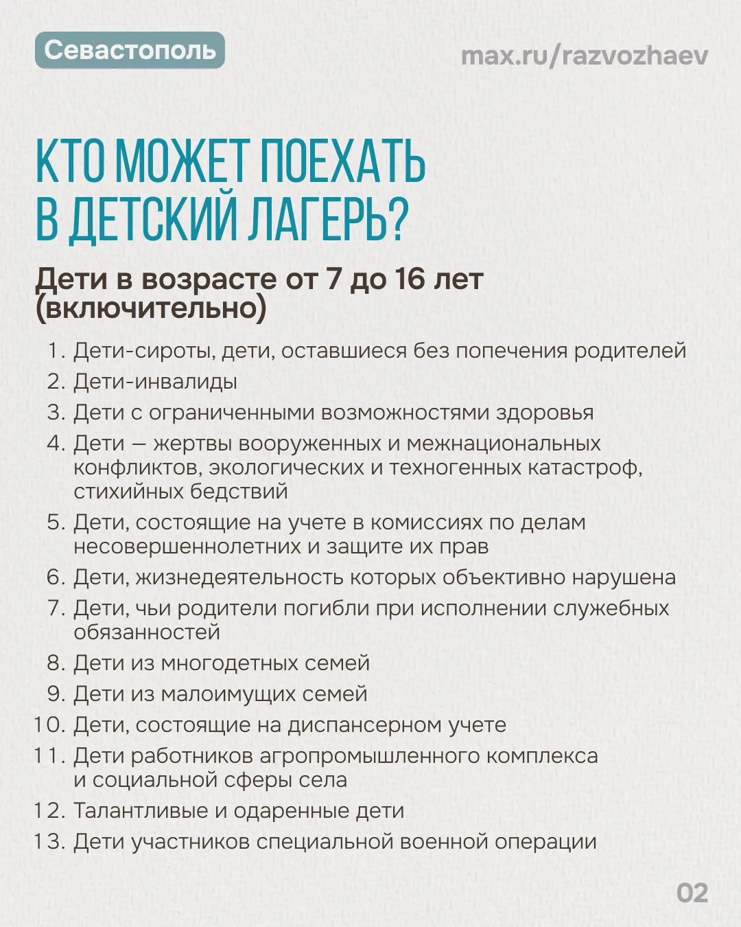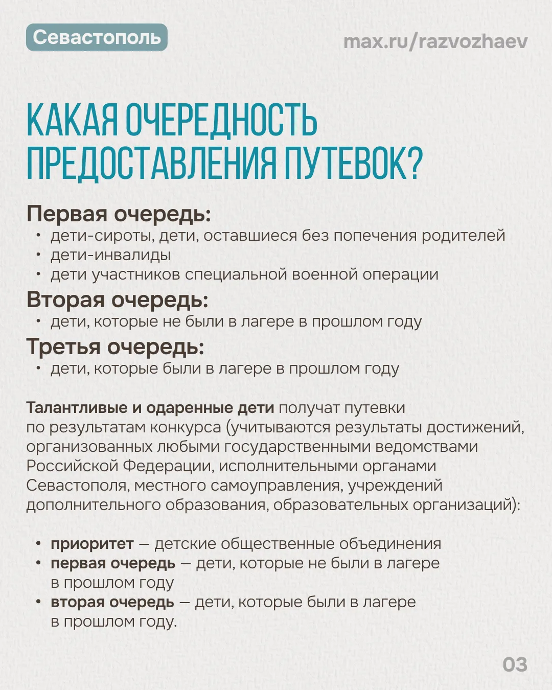 Первоочередное право на летний отдых имеют дети-сироты, дети-инвалиды и дети участников специальной военной операции. Вторую очередь составят дети отдельных категорий, которые не были обеспечены путевками в прошлом году. И третья очередь — это дети отдельных категорий, которые были в лагерях минувшим летом. Этот порядок мы утвердили в 2024 году, он остаётся без изменений.