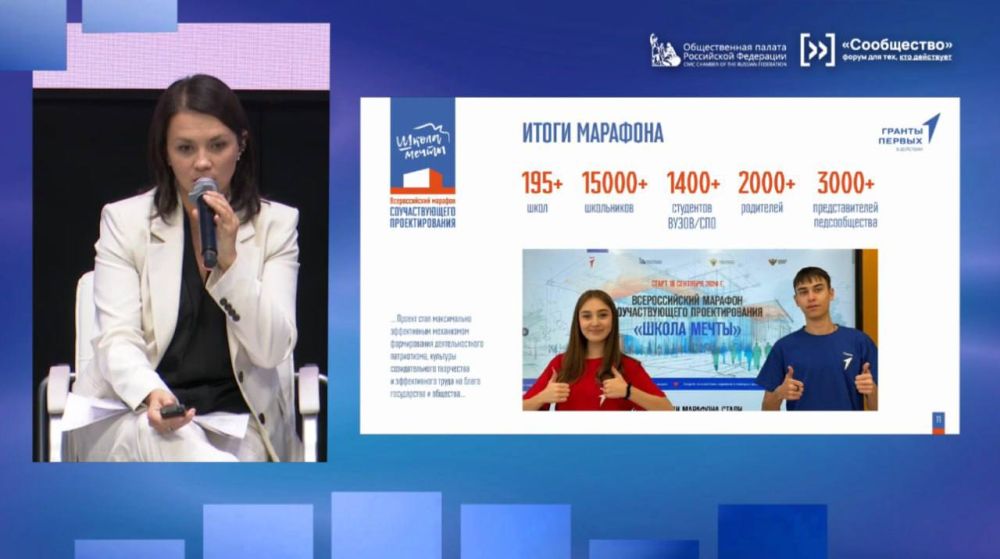 Сегодня в рамках итогового форума «Сообщество» Общественной палаты Российской Федерации на секции Комиссии по просвещению и воспитанию«Вовлечение молодежи в государственный и социальный дизайн как инструмент развития креативной экономики» были подведены итоги реализации Всероссийского марафона соучаствующего проектирования «Школа Мечты».
