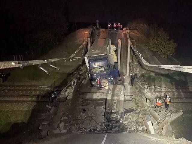 • позже в МЧС России уточнили, что мост, на котором в момент происшествия находились легковушка и грузовик, рухнул над ж/д-полотном;