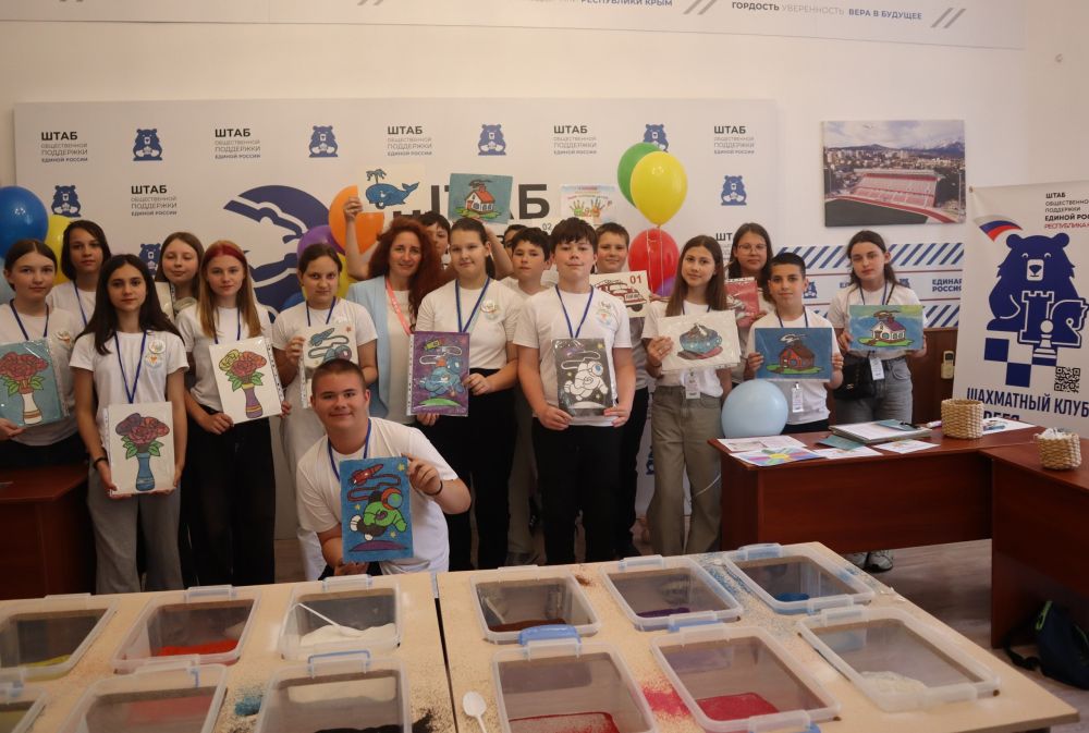 В преддверии Дня защиты детей на площадке Штаба общественной поддержки "Единой России" в Республике Крым организовали мастер-класс для детей "Песочное сияние" - рисование цветным песком на трафаретах.