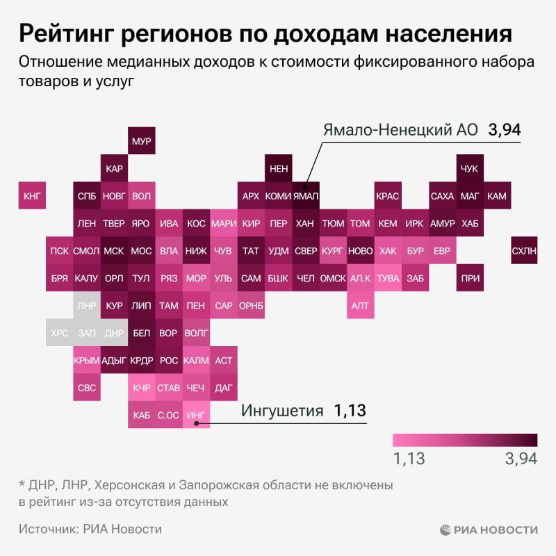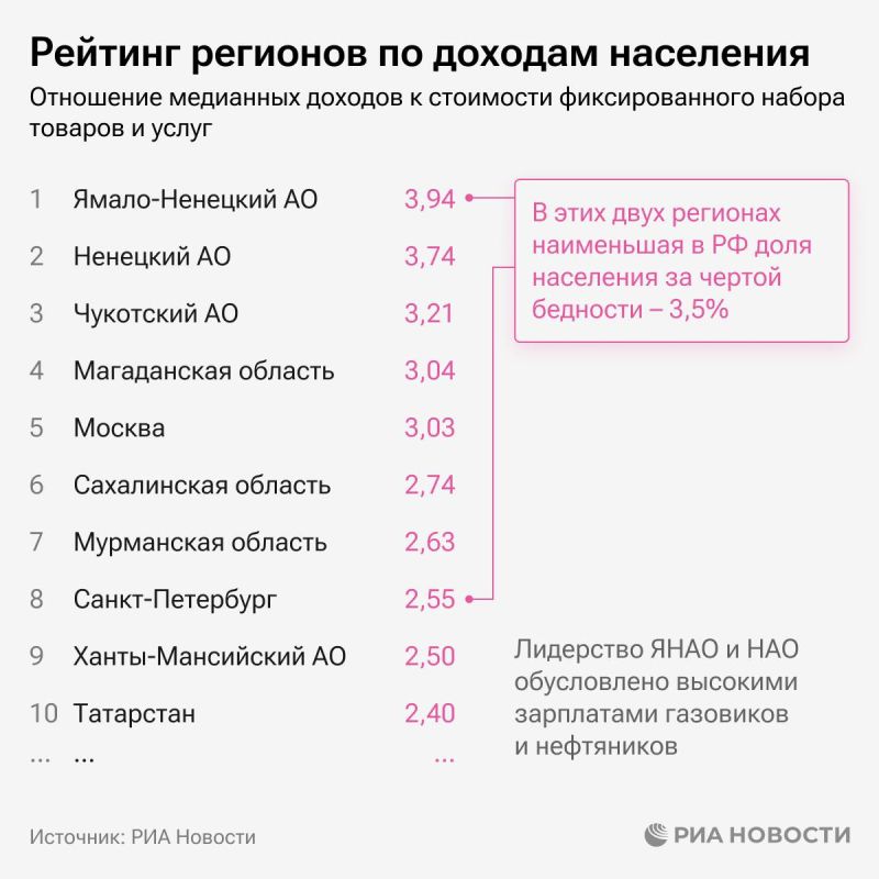 Лидерами рейтинга стали Ямало-Ненецкий, Ненецкий автономные округа и Чукотка, что обусловлено высокими зарплатами в этих регионах.