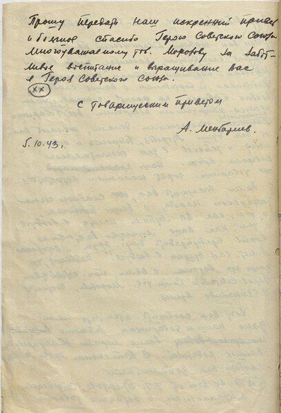 Автор письма передает пожелания побед и успехов адресату от его соотечественников и земляков. В письме сообщается о желании крымчан организовать встречу со своим земляком, услышать истории о подвигах в войне против немецких оккупантов. Также, Абдул Менбариев сообщает, что правительством Крымской АССР предпринимаются меры по эвакуации родителей Амет-Хан Султана из Крыма. Письмо было написано 5 октября 1943 года.