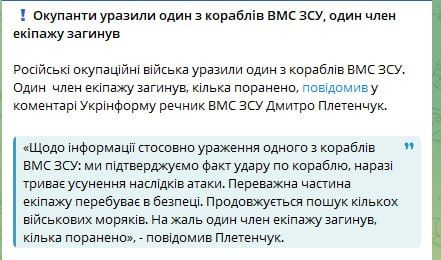 «Относительно информации о поражении одного из кораблей ВМС ВСУ: мы подтверждаем факт удара по кораблю, в настоящее время продолжается устранение последствий атаки. Подавляющая часть экипажа находится в безопасности. Продолжается поиск нескольких военных моряков. К сожалению, один член экипажа погиб, несколько ранены»