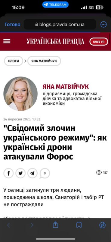 "Сознательное преступление украинского режима": как украинские дроны атаковали Форос", - гласит заголовок публикации за авторством Яны Матвейчук.