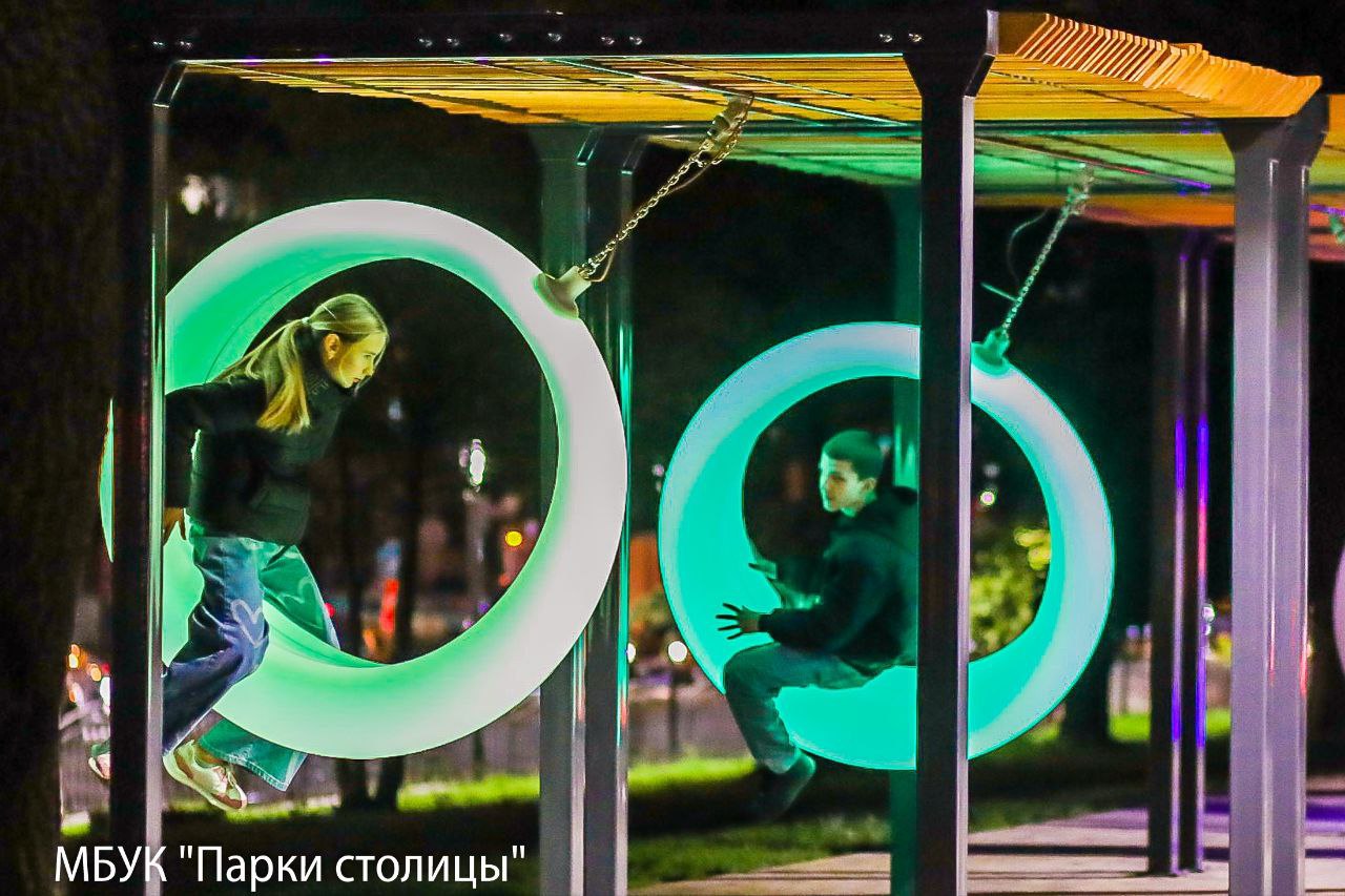 Особое внимание горожан привлекают светящиеся качели. Помимо комфорта и удобства, они создают атмосферу волшебства благодаря своему яркому свечению.