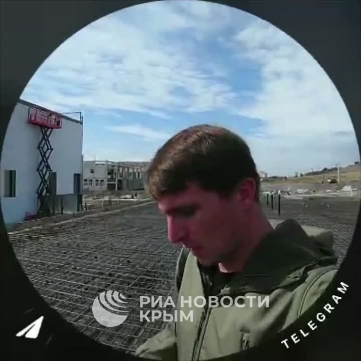 Корреспондент РИА Новости Крым Вадим работает на месте и показывает детали строительства, пробираясь по металлическому каркасу будущего здания.