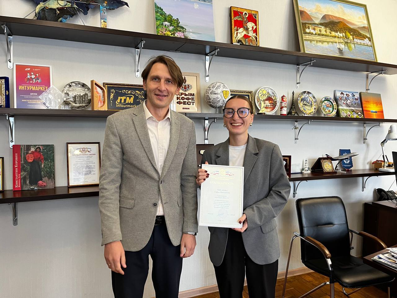 Сергей Ганзий вручил благодарности и памятные подарки корреспондентам Софии Чикановой (на первом фото), Никите Аброчнову и Алле Козбаненко — за оперативное и правдивое освещение тем туристской и санаторно-курортной отрасли Крыма.