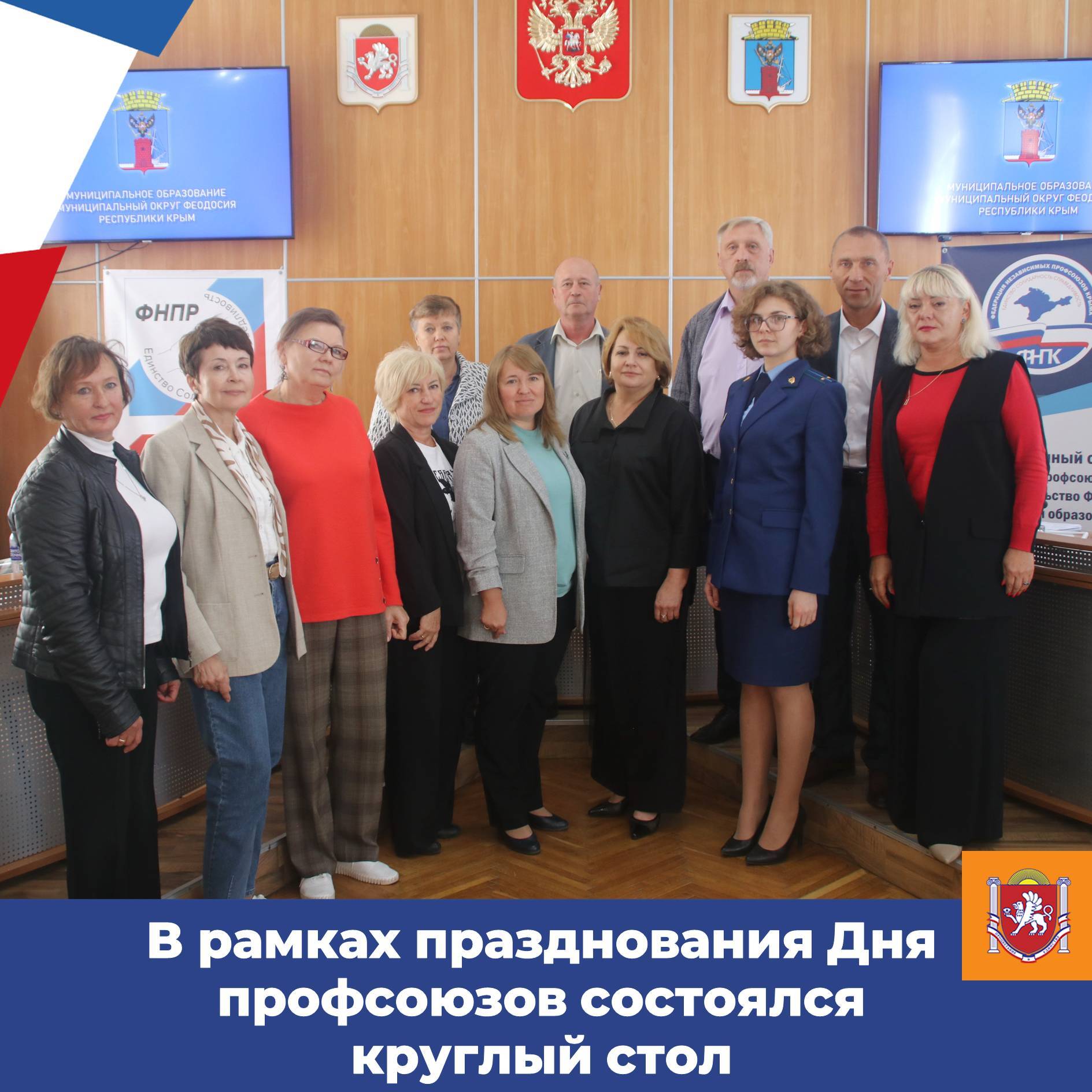 В рамках празднования Дня профсоюзов в городе Феодосии состоялся круглый стол с участием главы администрации города Феодосии, представителей структурных подразделений администрации города, Федерации независимых профсоюзов Крыма и отраслевых профсоюзов города Феодосии, прокуратуры, центра занятости.