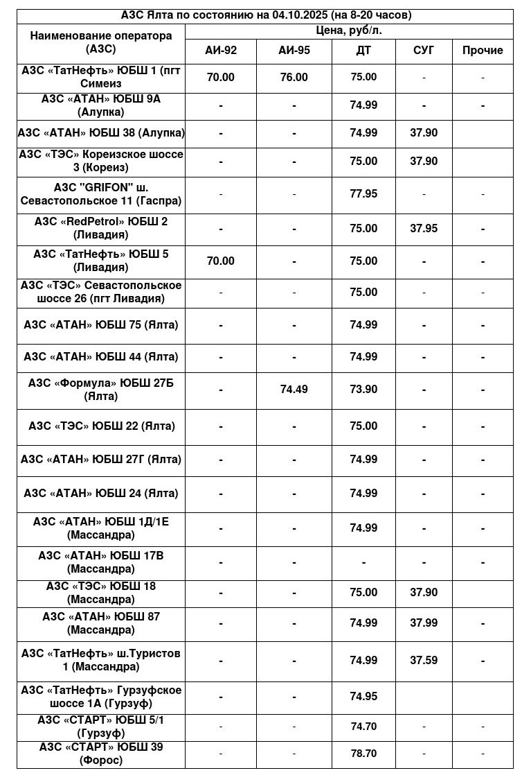 Актуальные данные о наличии топлива на АЗС Ялтинского региона на 09:00 4 октября 2025 года