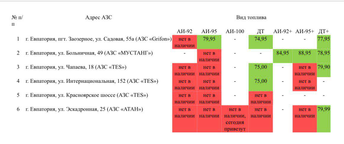 Уважаемые евпаторийцы!. Публикуем актуальные данные о наличии топлива на АЗС Евпатории на 14:00 4 октября 2025 года