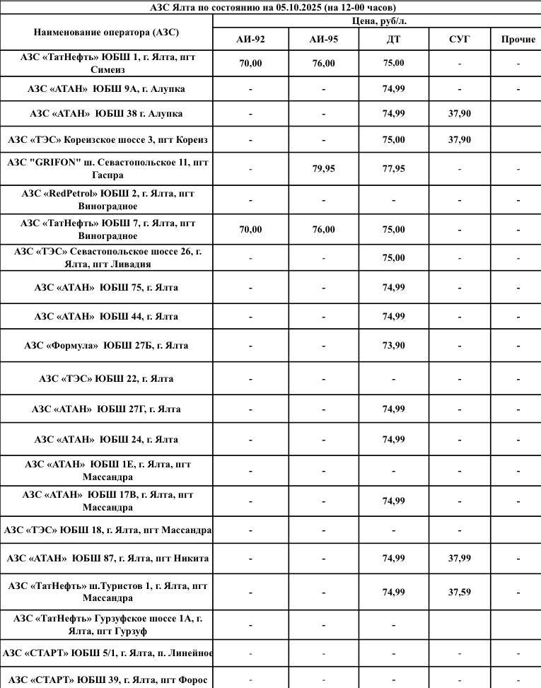 Уважаемые алуштинцы! Важная информация о наличии топлива в нашем муниципалитете по состоянию на 08:00 05.10.2025.#Алушта #ГалинаОгнёва #АдминистрацияАлушты