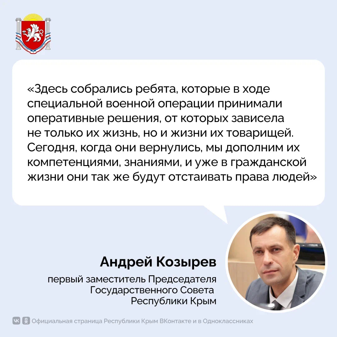 Первый заместитель Председателя Госсовета РК Андрей Козырев отметил значимость региональной кадровой программы «Герои Крыма» для региона и страны, а также подчеркнул, что органы государственной власти всегда будут поддерживать участников