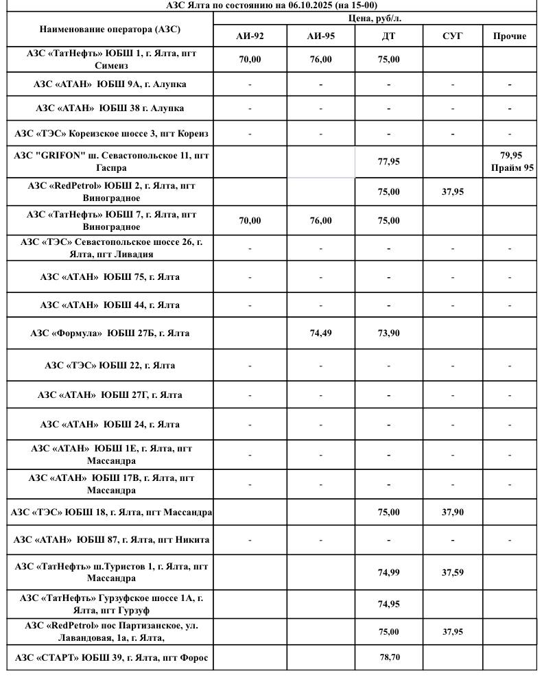 Актуальные данные о наличии топлива на АЗС Ялтинского региона на 15:00