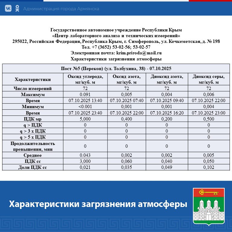 Данные с автоматического поста мониторинга атмосферного воздуха в г. Армянске.