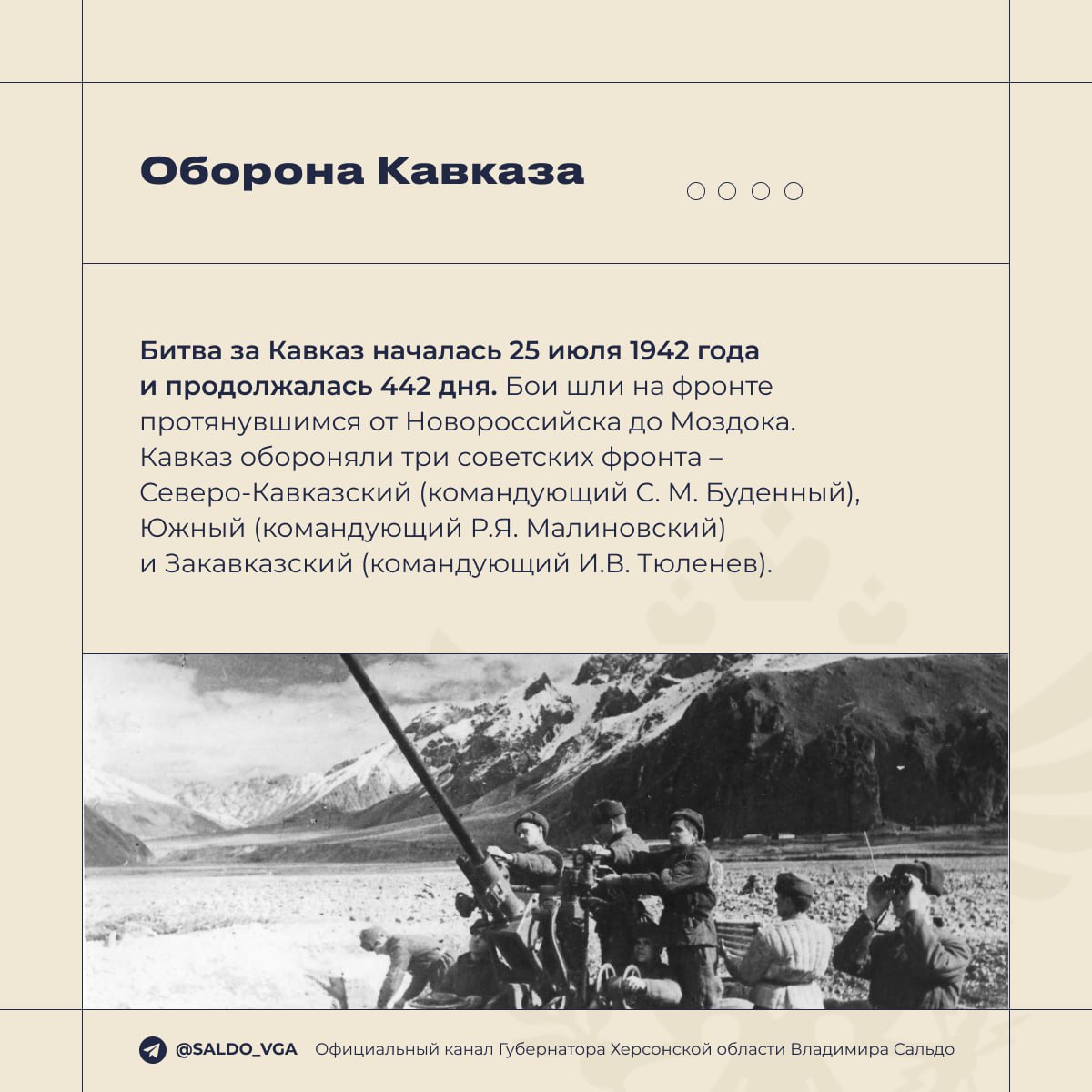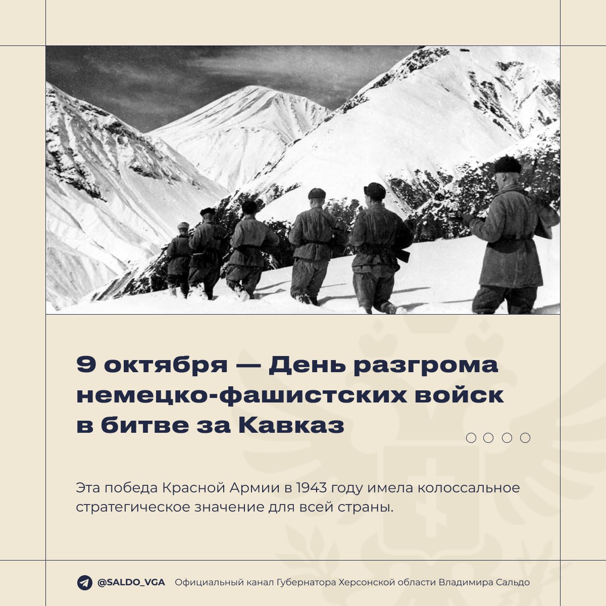 Владимир Сальдо: 9 октября 1943 года завершилась битва за Кавказ — одно из самых тяжёлых и кровопролитных сражений Великой Отечественной, которое продлилось 442 дня