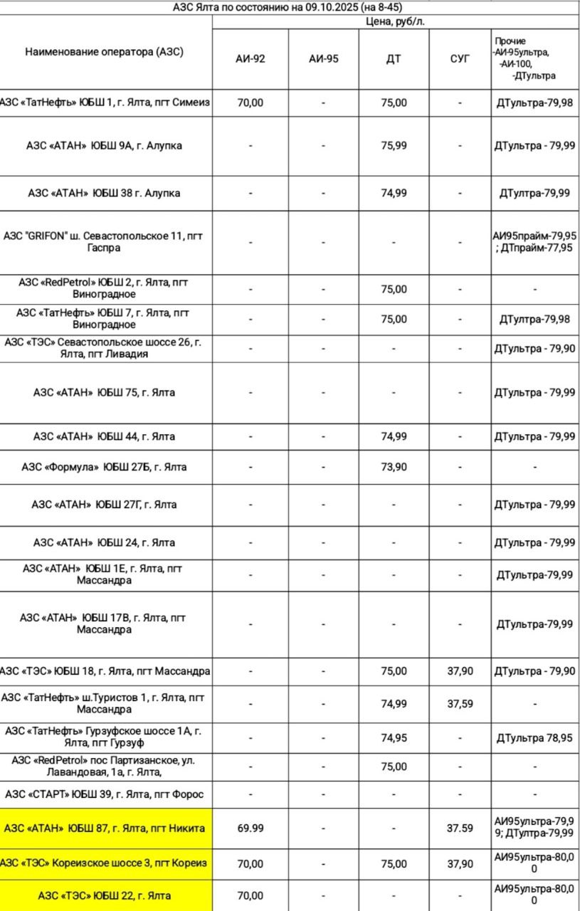 Актуальные данные о наличии топлива на АЗС Ялтинского региона на 08:45, 9 октября