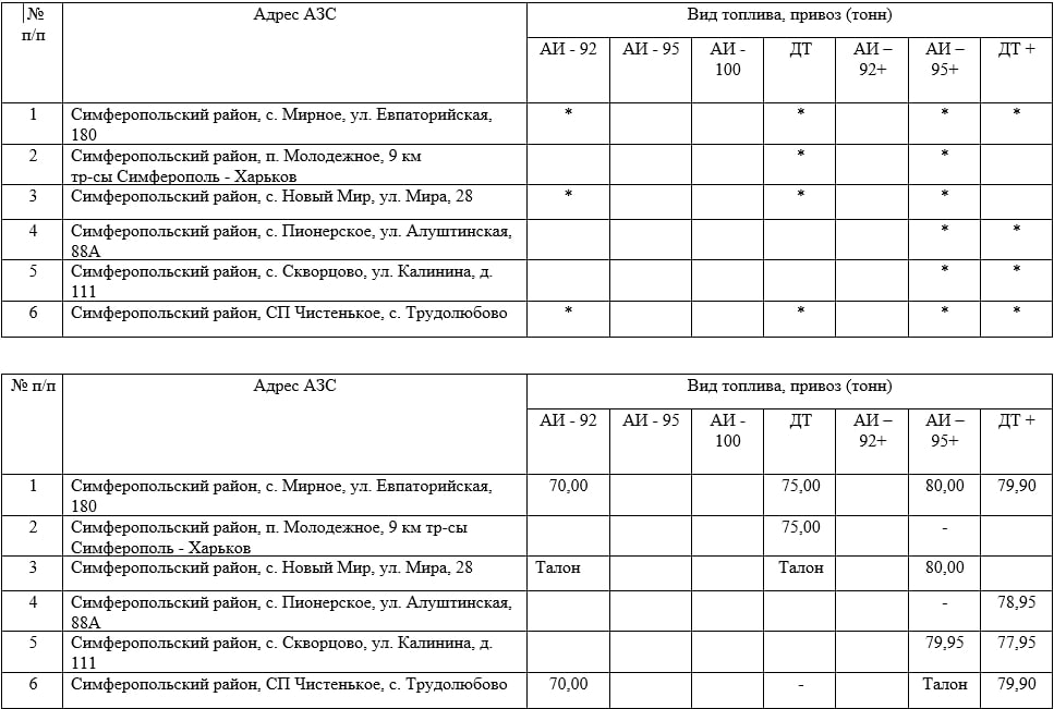 Публикуем информацию о наличии топлива на автозаправочных станциях расположенных на территории Симферопольского района за наличный расчет.