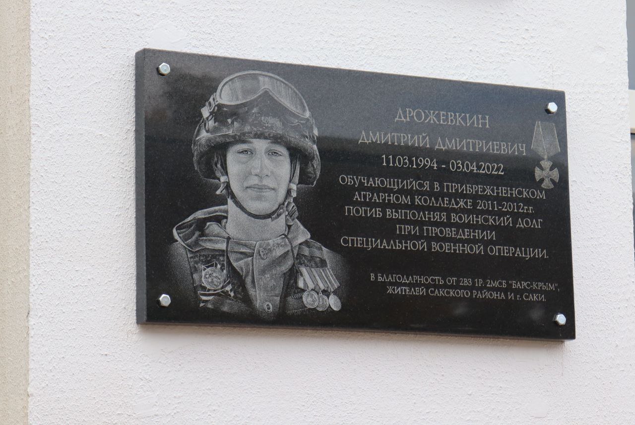 Сегодня на фасаде здания Прибрежненского аграрного колледжа состоялось открытие памятной мемориальной доски, посвященной погибшему при исполнении служебного воинского долга в Специальной военной операции земляку, который обучался в колледже- Дрожевкину Дмитрию Дмитриевичу.